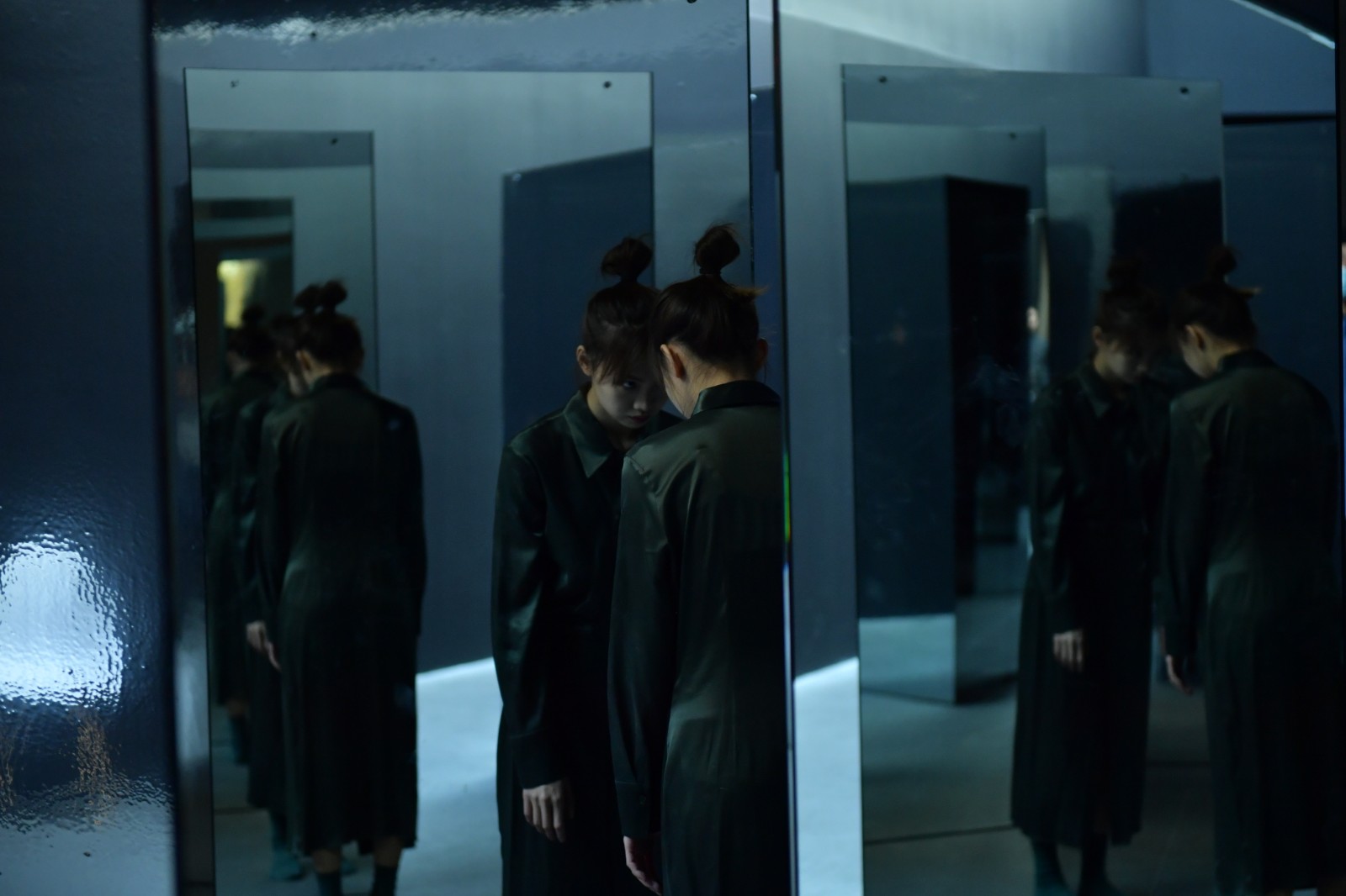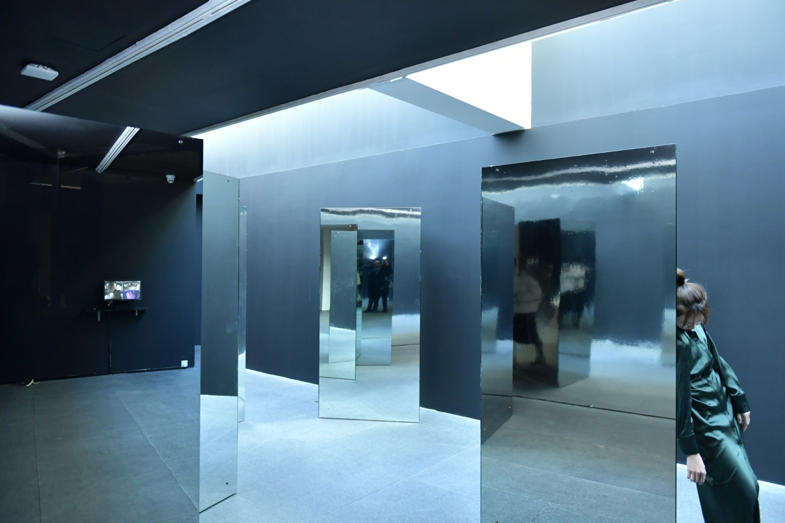 在OCAT研究中心展廳最明亮而寬闊的長(zhǎng)走廊上,紙老虎工作室借助六個(gè)鏡面反射的三棱柱營(yíng)造了一個(gè)劇場(chǎng)式的空間,邀請(qǐng)觀眾進(jìn)入并參與到劇目的演繹與發(fā)展中來(lái)。鏡面反射著“我”和周圍的環(huán)境,清晰地呈現(xiàn)著“我”在環(huán)境中的位置。