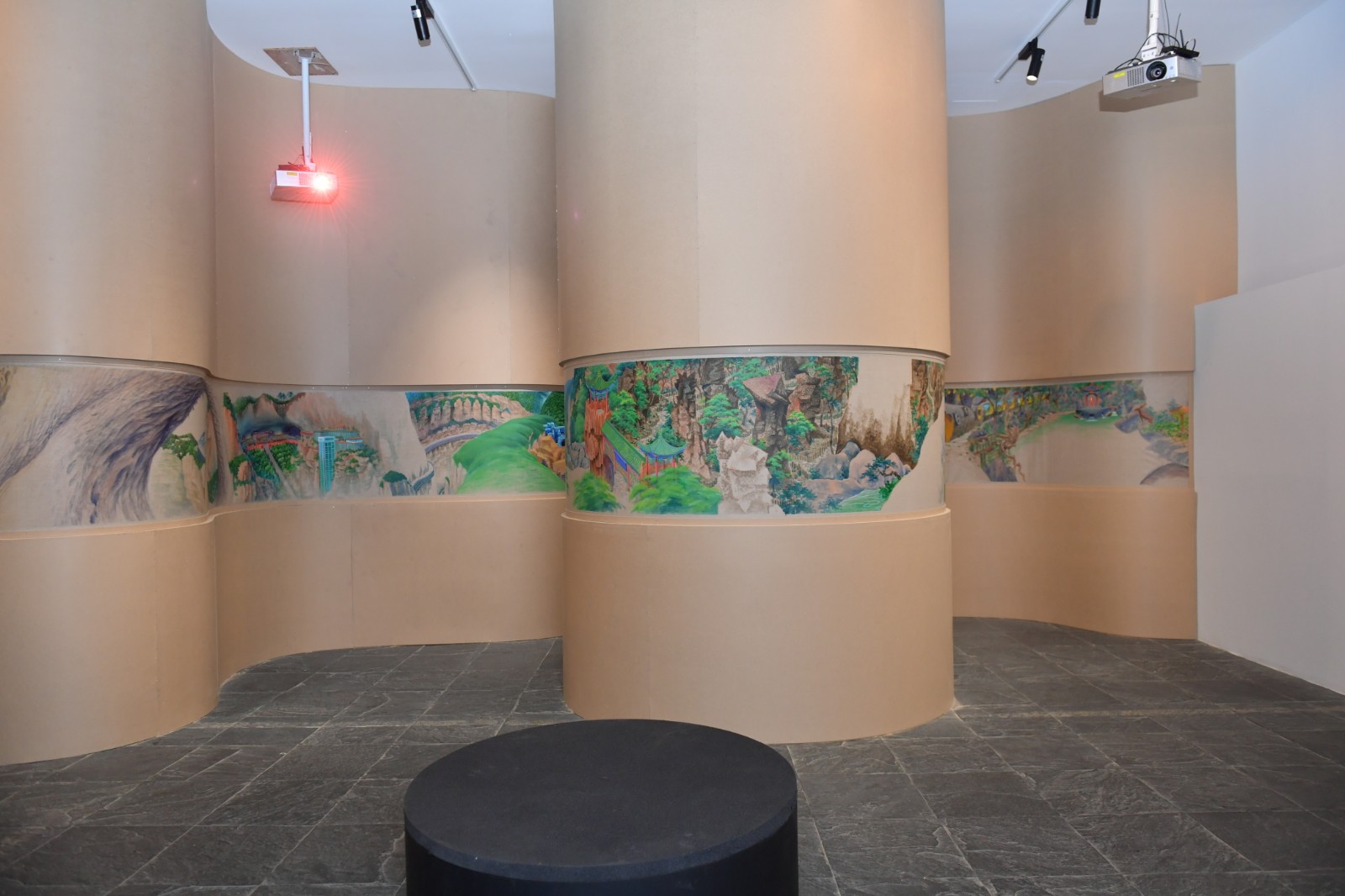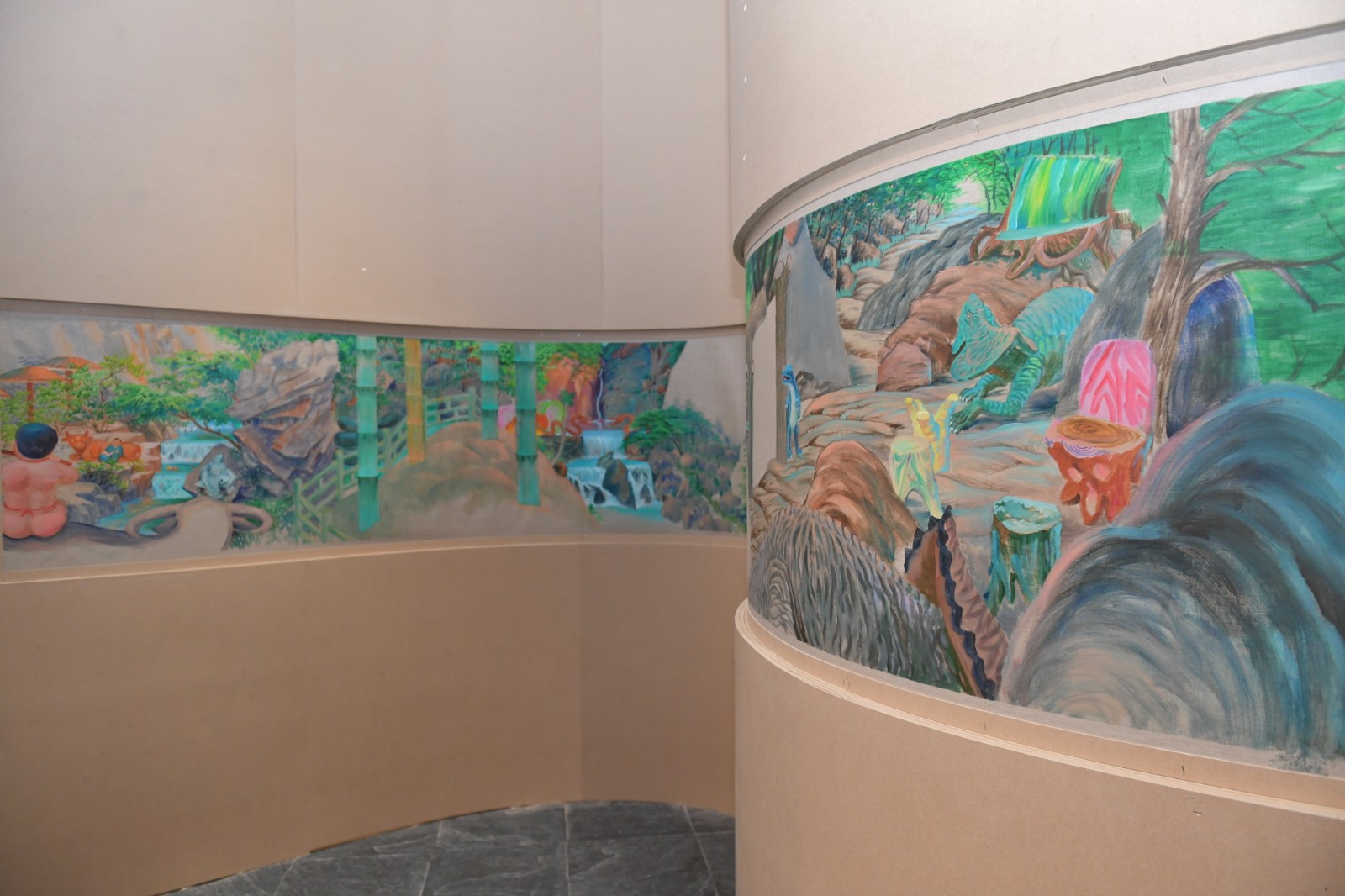 “地洞”一旁是展廳的下沉區(qū)域,這里被策展人設(shè)計(jì)為去往“桃花源”的實(shí)體路徑。梁碩的《景了個(gè)區(qū)》出現(xiàn)在這個(gè)下沉空間的一排四個(gè)口袋式的連續(xù)隔間墻面上,從空間上來(lái)說(shuō)是無(wú)比契合的?;仡櫫捍T2019年在北京公社的展覽《梁碩:景區(qū)》同樣可以見到這樣一種迂回的觀展路徑?!熬皡^(qū)”這個(gè)概念的提出,在藝術(shù)家看來(lái)代表著今天人們對(duì)山水的理解,這個(gè)獨(dú)特的概念跨越了自然景觀與都市空間。梁碩在自己撰文的《景了個(gè)區(qū)》中復(fù)原了一個(gè)景區(qū)籌備建立起來(lái)的小故事,承包景區(qū)改造的劉工在工期接近尾聲時(shí),看到自己的“杰作”時(shí)不由感嘆:“這些水泥造物,居然都妥妥的在那了,像是本來(lái)就是從山里長(zhǎng)出來(lái)的,那巨大的假山石和假樹根顯得造型怪異,卻頗得陳老蓮氣韻,在落日的余暉中與真山融為一體,真山也像了假山……”[6]景區(qū)的建立勢(shì)必意味著人工、商業(yè)、消費(fèi)對(duì)自然景觀的直接侵入與改造,空間、審美、意識(shí)形態(tài)等一系列問題由此發(fā)生。
