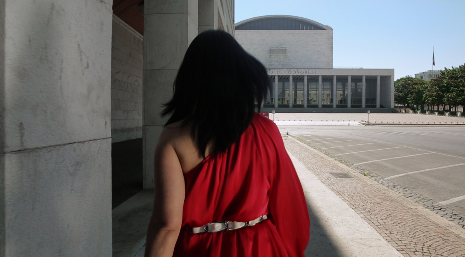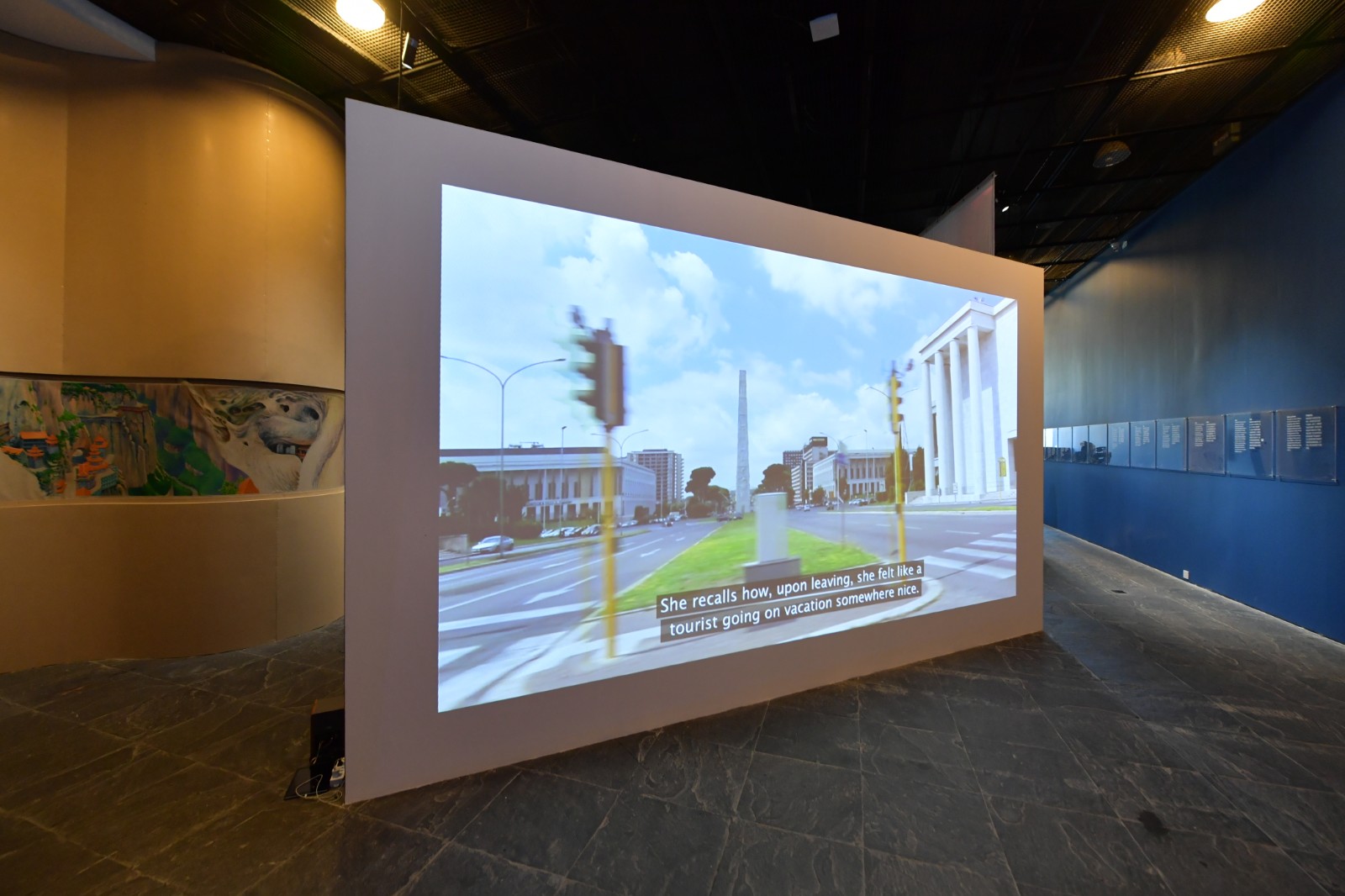 梅·海瑟格(Maj Hasager)《我們將在盲點(diǎn)相遇》是展覽呈現(xiàn)的最后一件作品,其講述了關(guān)于羅馬新城EUR區(qū)(Esposizione Universale di Roma)里的菲律賓移民的故事。這座由墨索里尼親自監(jiān)督設(shè)計(jì)的,以法西斯美學(xué)構(gòu)想出來(lái)的烏托邦城市,直至1960年才建成并被逐步被開發(fā)為羅馬新的富人區(qū)。海瑟格把眾多意大利導(dǎo)演在EUR區(qū)攝制的紀(jì)錄片、電影所刻畫的城市公共記憶,與這群定期在市中心一座教堂的地下室聚會(huì)的移民社群一同放入她的影像作品中,影像記錄了這個(gè)群體的閑暇時(shí)光,以一種個(gè)人的、私密的視角探索了菲律賓移民的私人記憶與生活如何融入并生存于這座有著強(qiáng)大歷史記憶的城市之中。正如約翰·伯格(John Berger)在《第七人》中的論述:“兩群不同的人在任何情況下,永遠(yuǎn)都是共性大于差異性的。只是由于種種原因,環(huán)境蒙蔽了人們的眼睛?!盵7]我們看得見的是歷史的記憶碾壓而過(guò)留下的軋痕以及其帶來(lái)的城市變遷,而看不見的是居于其中的人是如何在此種變遷中安放自我的記憶與故事。從這個(gè)立意來(lái)看,展覽所討論的議題似乎又回溯到了“公共”與“私人”,“歷史”與“記憶”之間的連接,然而涉及的場(chǎng)域已經(jīng)擴(kuò)展到了一個(gè)城市或是一種文化以外。