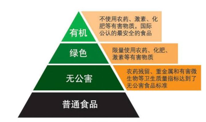 我國(guó)對(duì)農(nóng)產(chǎn)品的安全分類,包括有機(jī)、綠色、無(wú)公害三個(gè)等級(jí)。分別指對(duì)化肥、農(nóng)藥、激素、轉(zhuǎn)基因使用的不同要求。先看一張圖: