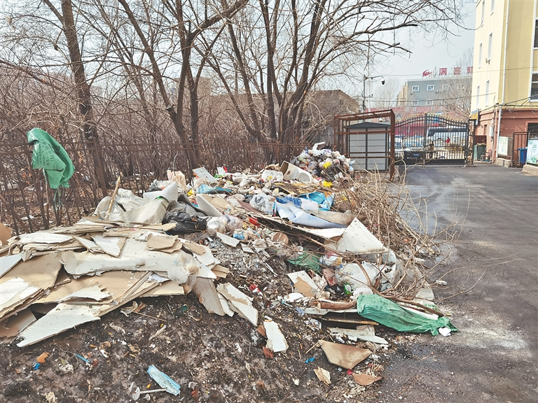 南崗區(qū)學(xué)府路300號至308號之間,是一片改造后的老舊小區(qū),一側(cè)大門還有戴紅袖標(biāo)的人員看守。進(jìn)入后,道路一側(cè)出現(xiàn)了垃圾帶,生活垃圾、裝修垃圾、放棄雜物和殘冰殘雪,堆出了20米的“長龍”。據(jù)這里的居民介紹,小區(qū)沒有物業(yè),衛(wèi)生由街道管理。“由于長期不外運(yùn),天熱的時候,這里的垃圾會很臭。其實小區(qū)環(huán)境還不錯,就是缺少管理。”