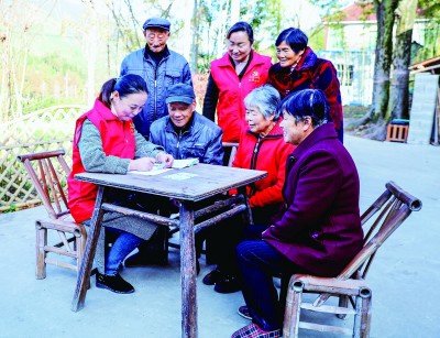 浙江長(zhǎng)興縣和平鎮(zhèn)方家莊村便民服務(wù)中心志愿者為村里老人上門辦理第三代社??〒Q證業(yè)務(wù)。新華社發(fā)