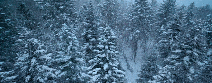 大幕拉開,風(fēng)雪交加,一望無際的茫茫林海里,是故事的開局之地。航拍第一視角的真實感鏡頭為我們呈現(xiàn)出開局的困頓感和林海雪原環(huán)境的壯美大氣。