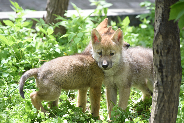 比起 “獨生子”的小羚羊,在狼散放區(qū)出生的小家伙們可真稱得上是大家庭了。同樣是四月份出生的狼崽們多達13只,新生娃數(shù)量目前在園里遙遙領先,他們分別來自于四個不同家庭,最多的一窩小狼崽有兄弟姐妹6個,最少的也是雙胞胎。這13只小狼崽斷奶后過起了集體生活,每天一起吃飯,一起睡覺,一起學習,一起玩耍,簡直不要太熱鬧。尤其是白天在室外運動場活動時,小狼崽們時而分成幾個小組活動,時而湊在一起,像一堆毛球擠成一團。在這其中有一只小狼不到滿月就顯示出了狼王的天性,小尾巴翹的高高的,一幅天不怕地不怕的樣子誰都敢挑戰(zhàn),勇敢值爆表。飼養(yǎng)員說它具有狼王潛質,幾年后有可能成為新的狼王。