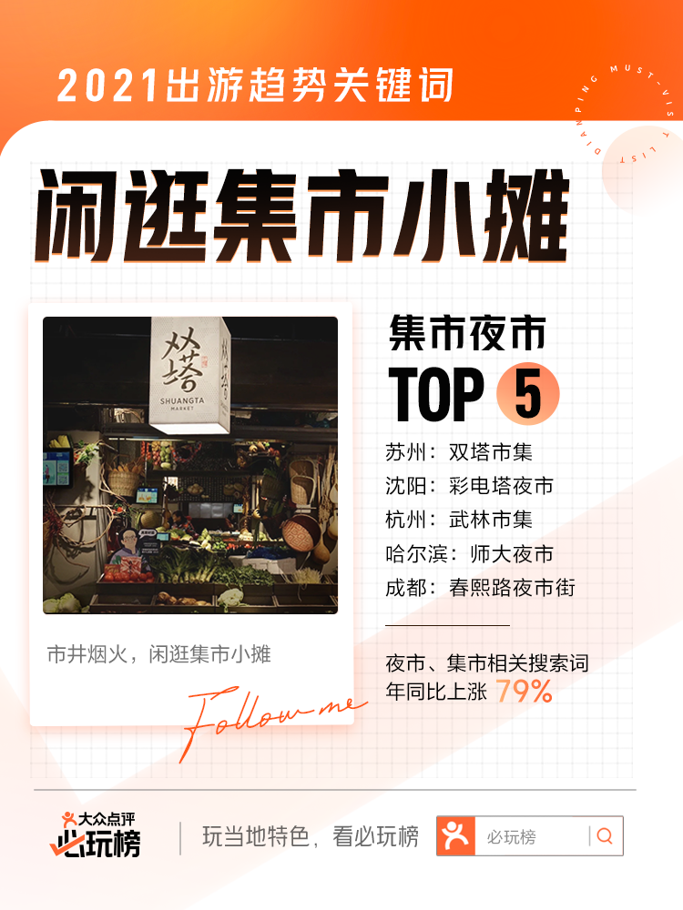 “市井煙火氣,最撫凡人心”,夜市、集市拓寬游客游玩半徑,為深度探索城市提供了更多可能。據(jù)“必玩榜”數(shù)據(jù)顯示,夜市、集市相關(guān)搜索詞年同比上漲79%,其中哈爾濱的師大夜市與蘇州的雙塔市集、沈陽(yáng)的彩電塔夜市、杭州的武林市集、成都的春熙路夜市街共同入選全國(guó)TOP5熱門集市夜市。