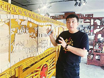 近年來,李寶峰大膽嘗試,在傳統(tǒng)木雕作品的基礎上不斷創(chuàng)新,懷著對黨的感恩和對家鄉(xiāng)的熱愛,不斷將作品注入紅色元素,積極探索設計創(chuàng)作具有時代氣息的木雕作品,用刀木刻畫春秋、記錄時代變遷。
