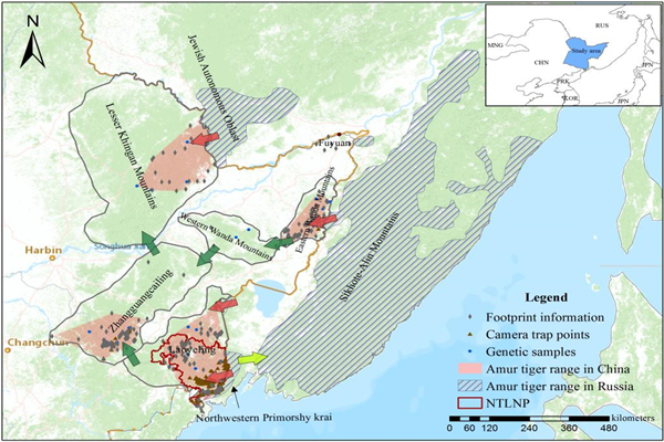 研究通過(guò)自動(dòng)相機(jī)記錄的影像數(shù)據(jù)共識(shí)別出野生東北虎55只(包括20只幼體),成年個(gè)體數(shù)量從2013年的7只增加到2018年的33只,同時(shí)通過(guò)糞便樣本遺傳信息鑒定出東北虎個(gè)體30只。在此期間,種群的平均增長(zhǎng)率為1.51%。與2000年時(shí)我國(guó)調(diào)查到12至16只野生東北虎相比,個(gè)體數(shù)量有了倍增性的恢復(fù),保護(hù)成效十分顯著。研究還發(fā)現(xiàn),我國(guó)境內(nèi)有東北虎穩(wěn)定分布的森林面積47,813 平方公里,其中老爺嶺區(qū)域18,029 平方公里;張廣才嶺區(qū)域10,941平方公里;完達(dá)山區(qū)域5580平方公里,小興安嶺區(qū)域13,263 平方公里。