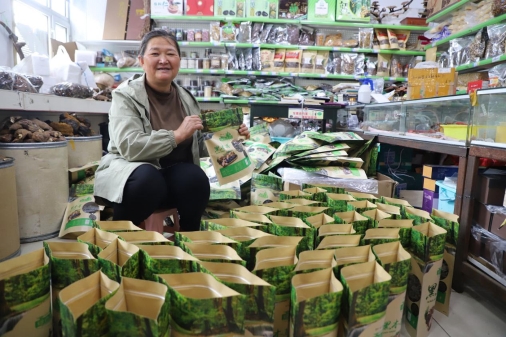 藍(lán)領(lǐng)山特產(chǎn)品店經(jīng)營(yíng)業(yè)戶高桂杰正在為客戶發(fā)貨