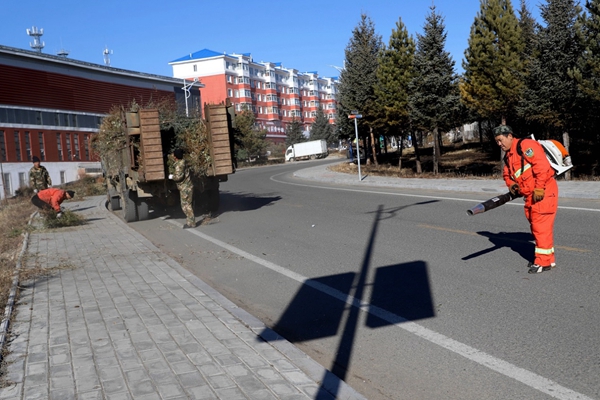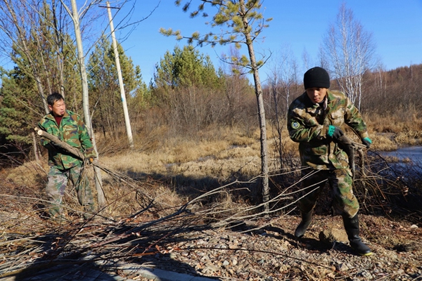 圖為阿木爾林業(yè)局森林消防大隊(duì)專業(yè)撲火隊(duì)員將修剪下來(lái)的樹枝裝車運(yùn)走(王力/攝)