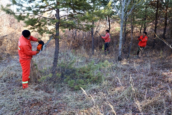 鑒于此,阿木爾林業(yè)局防火辦黨總支以“聚活力、樹形象、添光彩”為主題,結(jié)合“我為職工群眾辦實(shí)事”活動(dòng),組成黨員突擊隊(duì)帶領(lǐng)專業(yè)撲火隊(duì)員,拿起割灌機(jī)、手鋸等工具,當(dāng)起“理發(fā)師”“美容師”,清除路兩側(cè)的雜草,清理?xiàng)顦洹⒘鴺涞戎ρ倦s木,修剪落葉松、魚鱗松、樟子松的樹枝,再撿拾干凈、裝車運(yùn)走。