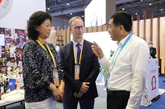 圖為大興安嶺林業(yè)集團(tuán)公司黨委副書記、總經(jīng)理李軍(左二)向法國參展企業(yè)推介北極冰藍(lán)莓酒莊紅酒系列產(chǎn)品(王力/攝)