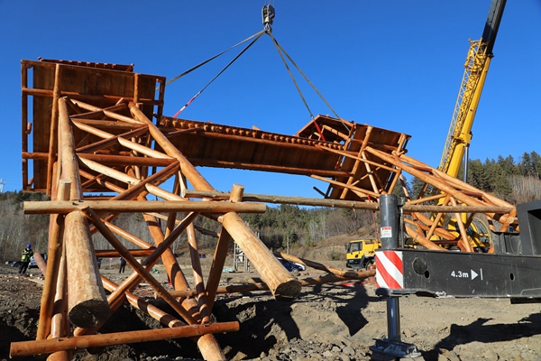早上10點58分,只見平靜的林業(yè)局薩布素軍馬場頓時熱鬧了起來,兩臺大型起重機(jī)發(fā)動機(jī)嗡嗡作響,一東一西緩慢吊起10多噸重的大門,因偏向一側(cè)首次作業(yè)沒有成功。安裝技術(shù)人員調(diào)整重心點,第二次試舉,并在一臺裝載機(jī)的協(xié)助下,調(diào)整機(jī)位,歷時2個多小時,才將具有濃郁驛站文化風(fēng)格的高10米、寬14米的木質(zhì)大門,矗立在平地上。