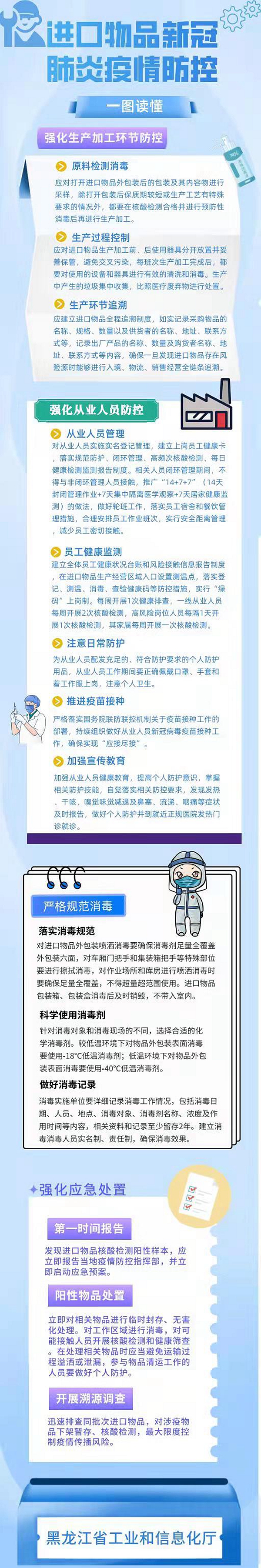 公開信表示,近期疫情反彈形勢嚴(yán)峻復(fù)雜,為確保工業(yè)企業(yè)不發(fā)生聚集性疫情,共同構(gòu)筑疫情防控堅(jiān)固防線,提示:涉及進(jìn)口物品加工、使用的工業(yè)企業(yè)要嚴(yán)格按照《黑龍江省進(jìn)口物品新冠肺炎疫情風(fēng)險防控工作方案》落實(shí)各項(xiàng)防疫措施。一要強(qiáng)化生產(chǎn)加工環(huán)節(jié)的防控。生產(chǎn)前做好原料檢測消毒,生產(chǎn)中做好過程控制,設(shè)備和器具進(jìn)行有效的清洗和消毒避免交叉污染,產(chǎn)生的垃圾集中收集,比照醫(yī)療廢棄物進(jìn)行處置。建立進(jìn)口物品全程追溯制度,確保一旦發(fā)現(xiàn)進(jìn)口物品存在風(fēng)險源時能夠進(jìn)行入境、物流、銷售經(jīng)營全鏈條追溯。二要強(qiáng)化從業(yè)人員防控。對員工實(shí)施實(shí)名登記管理,做好員工健康監(jiān)測和核酸檢測,合理安排作業(yè)班次,減少密切接觸。配發(fā)充足并符合防護(hù)要求的個人防護(hù)用品,加強(qiáng)員工健康教育,提高個人防護(hù)意識。嚴(yán)格落實(shí)當(dāng)?shù)仃P(guān)于疫苗接種工作的部署,持續(xù)組織做好員工新冠病毒疫苗接種工作,確保實(shí)現(xiàn)“應(yīng)接盡接”。三要嚴(yán)格規(guī)范消毒。對進(jìn)口物品外包裝、加工場所、車廂門把手和集裝箱把手等要嚴(yán)格按照規(guī)范消毒,消毒時要確保足量全覆蓋并針對消毒對象和消毒現(xiàn)場的不同選擇合適的化學(xué)消毒劑。詳細(xì)記錄消毒工作情況,建立消毒人員實(shí)名制、責(zé)任制,確保消毒效果。四要強(qiáng)化應(yīng)急處置。發(fā)現(xiàn)進(jìn)口物品核酸監(jiān)測陽性樣本,應(yīng)立即報告當(dāng)?shù)匾咔榉揽刂笓]部,并同步啟動應(yīng)急預(yù)案。對相關(guān)物品進(jìn)行臨時封存、無害化處理,對工作區(qū)域進(jìn)行消毒,對可能接觸的人員開展核酸檢測和健康篩查。迅速排查同批次進(jìn)口物品,最大限度控制疫情傳播風(fēng)險。