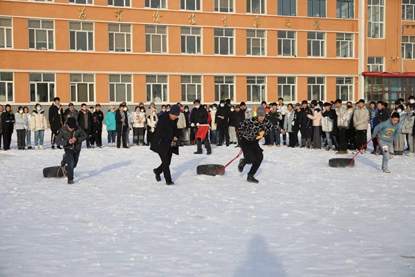 組織開展拉輪胎跑比賽。拉輪胎跑比賽在各年級(jí)間進(jìn)行,每班6名選手,50米往返,以時(shí)間少者為勝。隨著裁判老師一聲令下,比賽開始,選手們立馬拉起了輪胎奮力向前沖刺,克服雪地不利的條件,參賽選手飛快地向終點(diǎn)奔跑,掌聲、加油聲響徹操場(chǎng)。冬日的操場(chǎng)上,一個(gè)個(gè)