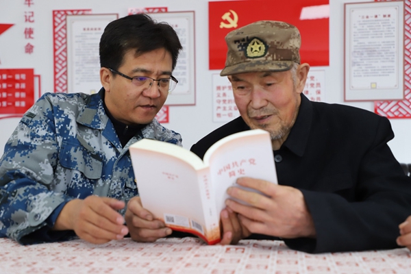 阿木爾林業(yè)局黨委委員、組織部部長(zhǎng)王立昆與退休老黨員張俊峰共同學(xué)習(xí)黨史(王力 攝)