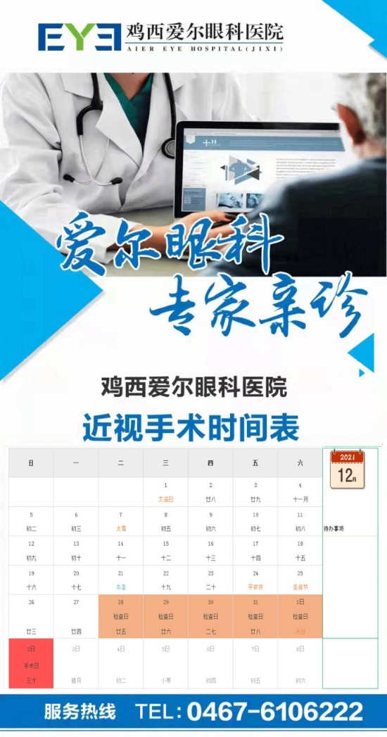 雞西愛爾眼科醫(yī)院近視手術(shù)時間表: