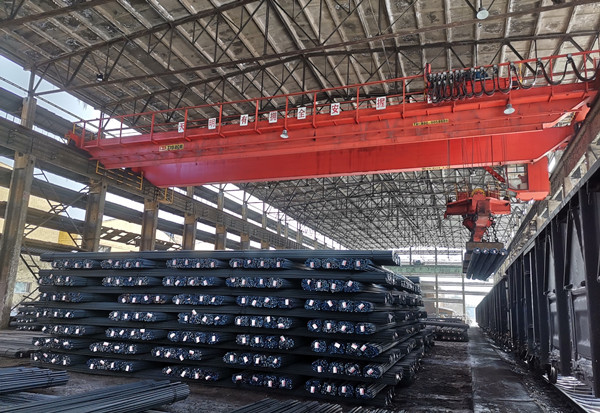 鋼材成品庫吊車吊運(yùn)鋼材