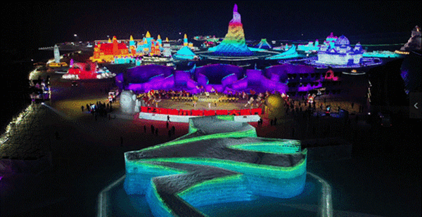 在30分鐘的暖場表演中,黑龍江哈爾濱、新疆阿勒泰、江蘇南京、廣東深圳等地舉行了慶?;顒?,并以連線的方式與暖場演出進行互動。其中,哈爾濱的互動表演節(jié)目現場,選在了被譽為“黑龍江冰雪旅游名片”的哈爾濱冰雪大世界。
