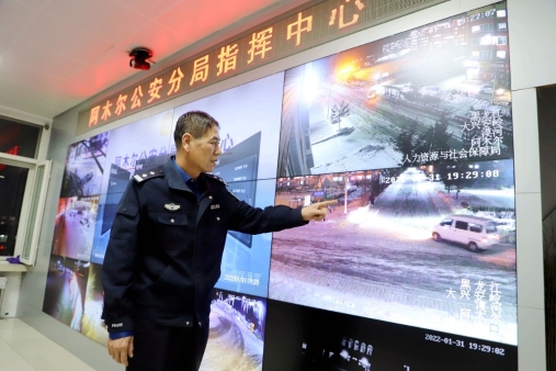 阿木爾公安分局干警在大年三十晚上110指揮中心值班,通過大型電子顯示屏查看治安情況(王力 攝)