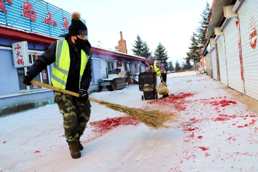 黑龍江經(jīng)濟(jì)網(wǎng)訊(王力 記者馬朝林)天剛蒙蒙亮,呈現(xiàn)眼前的是大年三十夜晚燃放的鞭炮紙屑,遍地開花,仿佛是紅地毯一樣。多名環(huán)衛(wèi)工冒著零下30多度的嚴(yán)寒,不顧帽子、眉毛結(jié)滿冰霜,有的用掃帚清掃,有的撿拾紙屑煙頭,有的推移垃圾箱……