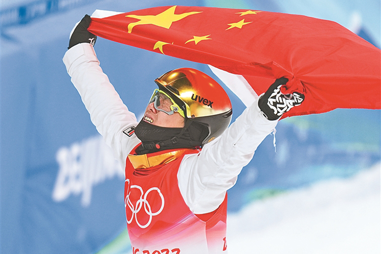 2月16日,中國選手齊廣璞比賽后慶祝。新華社記者 薛玉斌 許暢攝