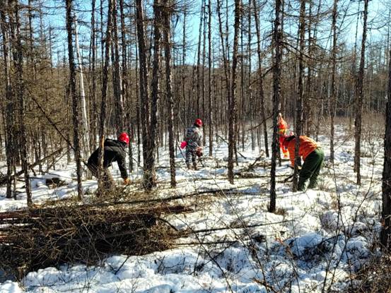 圖強(qiáng)林業(yè)局營(yíng)林工人們?cè)诹珠g清理?yè)嵊ρ荆ㄚw明 攝)
