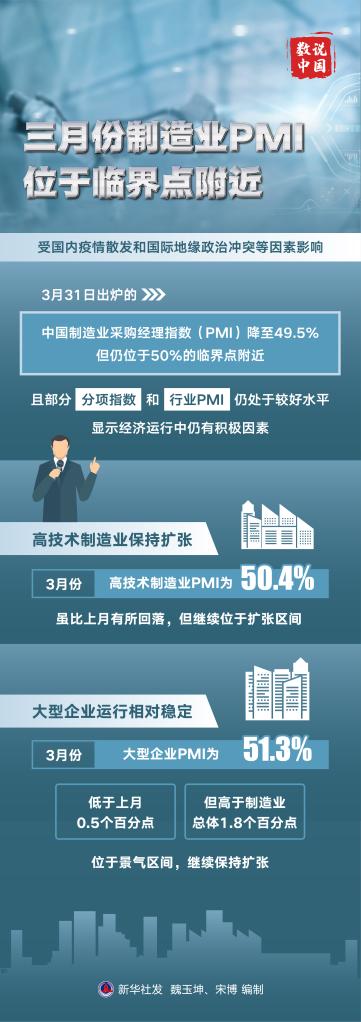 新華社北京3月31日電 (記者 魏玉坤)受國內(nèi)疫情散發(fā)和國際地緣政治沖突等因素影響,31日出爐的中國制造業(yè)采購經(jīng)理指數(shù)(PMI)降至49.5%,但仍位于50%的臨界點(diǎn)附近,且部分分項(xiàng)指數(shù)和行業(yè)PMI仍處于較好水平,顯示經(jīng)濟(jì)運(yùn)行中仍有積極因素。