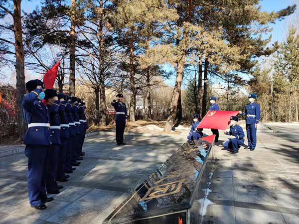在革命烈士紀(jì)念碑前,全體指戰(zhàn)員整齊列隊(duì),莊嚴(yán)肅穆,向長(zhǎng)眠在這里的革命烈士致以崇高的敬意,深切緬懷那些為了新中國(guó)拋頭顱、灑熱血的先烈們。緊接著,指戰(zhàn)員面向紀(jì)念碑,高舉右手,重溫入黨誓詞。