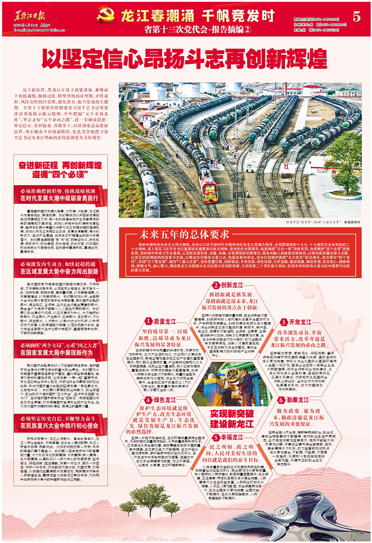 邁上新征程,黑龍江正處于政策疊加、乘勢而上的機遇期,爬坡過坎、轉(zhuǎn)型升級的攻堅期,矛盾累積、風險交織的凸顯期,激發(fā)潛力、振興發(fā)展的關(guān)鍵期。全省上下要堅決貫徹落實習近平總書記重要講話重要指示批示精神,牢牢把握“五個有利條件”,堅定走好“五個必由之路”,進一步解放思想、堅定信心、勇?lián)姑?、真抓實干,以昂揚姿態(tài)奮進新征程,用不懈奮斗再創(chuàng)新輝煌,扎扎實實地把習近平總書記為龍江擘畫的宏偉藍圖變?yōu)槊篮矛F(xiàn)實。