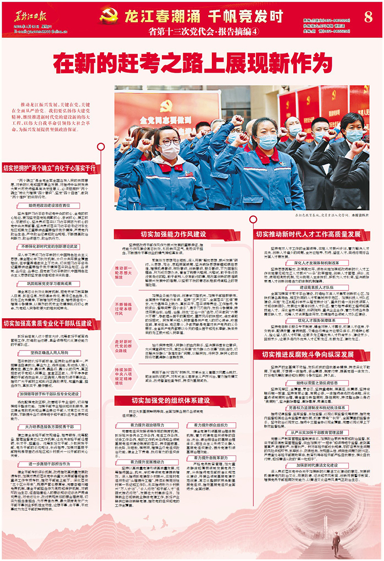 推動龍江振興發(fā)展,關(guān)鍵在黨,關(guān)鍵在全面從嚴(yán)治黨。我們要弘揚(yáng)偉大建黨精神,繼續(xù)推進(jìn)新時代黨的建設(shè)新的偉大工程,以偉大自我革命引領(lǐng)偉大社會革命,為振興發(fā)展提供堅強(qiáng)政治保證。