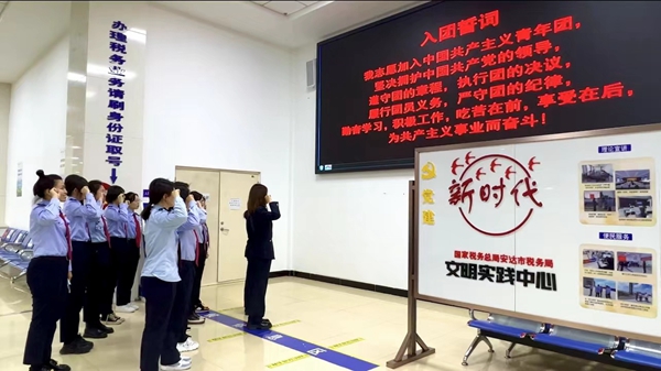 重溫入團誓詞,匯聚青春力量。為進一步引導(dǎo)廣大團員青年厚植愛國、愛黨、愛稅收事業(yè)的深厚情感,進一步增強團支部的組織力量,安達市稅務(wù)局團支部開展重溫入團誓詞活動,在莊嚴(yán)的團歌聲中,11名安達市稅務(wù)局奮戰(zhàn)在稅收一線的團員干部在團支部書記的帶領(lǐng)下,面向誓詞莊嚴(yán)宣誓。宣誓完畢后,安達稅務(wù)青年紛紛表示,將立足本職、埋頭苦干,用一流的業(yè)務(wù)能力為納稅人繳費人帶來一流的納稅服務(wù)體驗,為安達稅收事業(yè)奉獻青春力量。