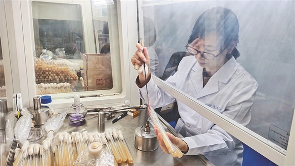 科研人員正在提取菌種。