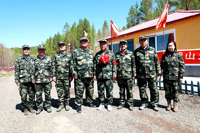 阿木爾林業(yè)局、依東林場領(lǐng)導(dǎo)干部與即將退休的共產(chǎn)黨員、管護(hù)員滿德江合影。(王力 攝)