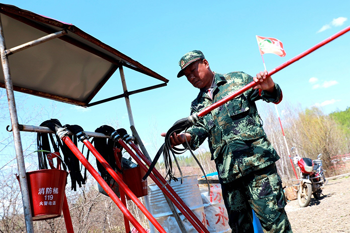 共產(chǎn)黨員、管護(hù)員滿德江站好最后一班崗,準(zhǔn)備升防火預(yù)警旗。(王力 攝)