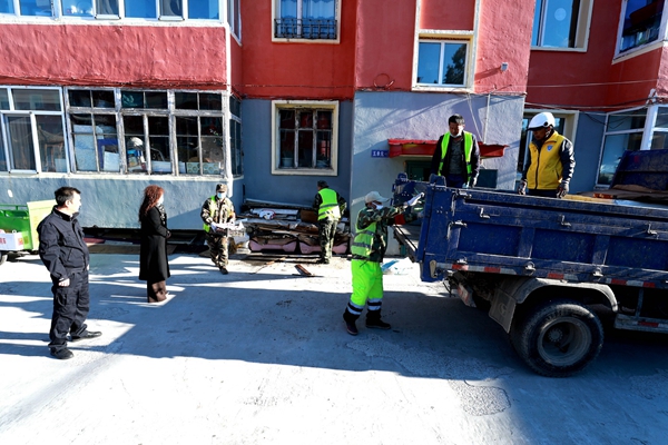 阿木爾林業(yè)局管理服務(wù)中心聯(lián)合環(huán)衛(wèi)隊(duì)清理樓前亂堆亂放雜物(王力 攝)