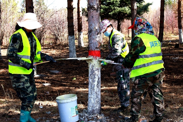 阿木爾林業(yè)局環(huán)衛(wèi)工為道路兩側(cè)綠化樹木涂抹防啃劑,保護(hù)生態(tài),美化環(huán)境(王力 攝)
