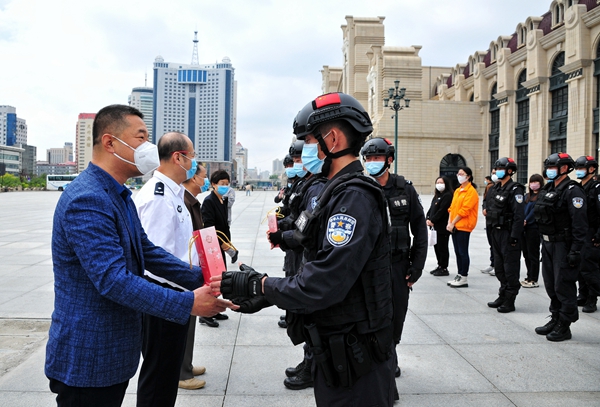 公益活動首批慰問對象是剛從抗疫一線歸來的哈爾濱市公安局巡特警支隊隊員。本次疫情期間,他們馳援五常市拉林鎮(zhèn)、哈爾濱市平房區(qū)和賓縣,先后核查車輛3700余臺,幫助群眾1100多人,為群眾配送餐食10萬余份、飲用水20余萬瓶、防疫物資9000余件,用血肉身軀筑起了抗擊疫情的鋼鐵長城,詮釋了“疫情當前,特警在先”的使命擔當。“感謝黑龍江日報報業(yè)集團和愛心企業(yè)送來健康產(chǎn)品。今后我們會一如繼往做好本職工作,哪里需要哪里上,當好人民的忠誠衛(wèi)士?!苯舆^“小綠君”,哈爾濱市公安局巡特警支隊特警一大隊二中隊教導員劉甲洲一臉幸福。