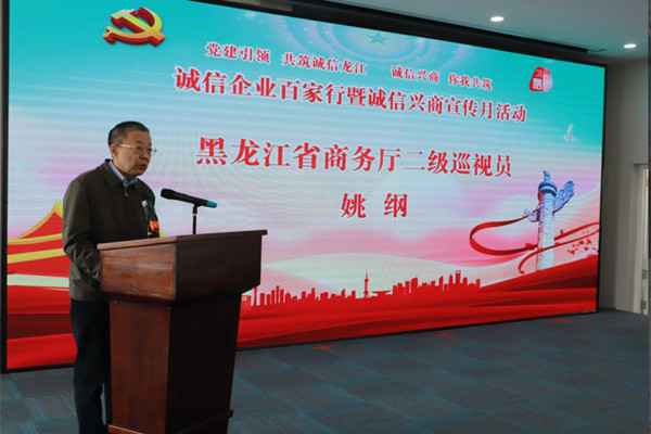 省商務廳二級巡視員姚綱在致辭中指出,此次黑龍江省“誠信企業(yè)百家行”暨“誠信興商宣傳月”活動,是加強誠信宣傳,提升全社會誠實守信意識,優(yōu)化消費和營商環(huán)境的一次重要舉措。省商務廳將會同相關單位統(tǒng)籌協(xié)調、密切配合,做到政府帶頭講誠信,商貿流通企業(yè)為“誠信興商”活動主體,通過宣傳商務誠信文化和信用管理知識,引導市場主體樹立誠信興商經營理念,提高信用管理能力,營造崇信守法的營商環(huán)境。培育消費者信用消費習慣,提升風險防范意識,依法維護自身合法權益,引導和帶動整個商貿行業(yè)的誠信建設。