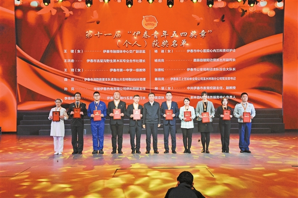 市領(lǐng)導(dǎo)郭廣福、呂瑞晏、肖爽、田寧和各界青年代表觀看了演出,并分別為第十一屆“伊春青年五四獎(jiǎng)?wù)隆薄?022年伊春市“向上向善好青年”、2021年度全市“兩紅兩優(yōu)”獲獎(jiǎng)代表頒獎(jiǎng)。