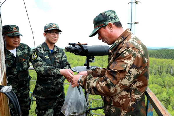 阿木爾林業(yè)局紅旗林場(chǎng)黨員干部在端午節(jié)這天把職工包的粽子送到“阿08”瞭望塔瞭望員鄭巖(右一)手中(王力 攝)