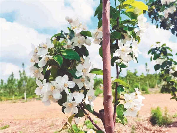 從尚志林場(chǎng)放眼望去,270畝寒地林果栽培示范基地在藍(lán)天白云的映襯下顯得頗為壯觀。龍豐、海棠、雞心果等萬(wàn)余株寒地林果整齊排列,枝頭花朵競(jìng)相綻放。