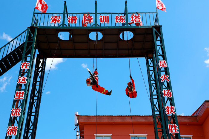 阿木爾林業(yè)局專業(yè)撲火隊員進行索滑降訓練(王力 攝)