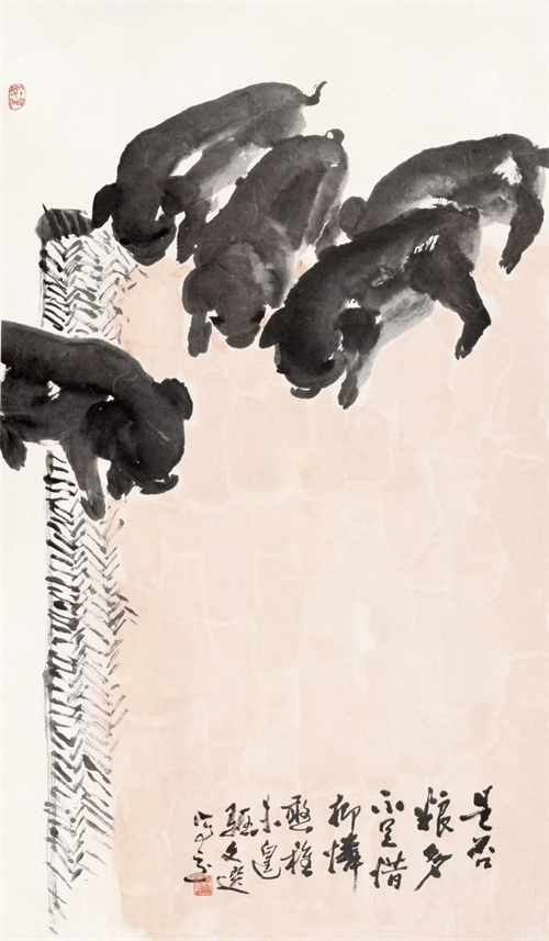 湯文選的人物、山水、花鳥、墨虎等一系列作品,融會(huì)著、貫穿著“三種傳統(tǒng)”。或隱或顯,或化解之,或凝聚之,或熔裁之,或獨(dú)造之。“三種傳統(tǒng)”,可概括為現(xiàn)實(shí)主義在中國(guó)畫發(fā)展歷程中的三段式,亦曰交叉出現(xiàn)的不同歷史內(nèi)涵、文化反映的三種藝術(shù)狀態(tài):首先,是古代現(xiàn)實(shí)主義傳統(tǒng)——“外師造化,中得心源”。其二,是“五四”現(xiàn)實(shí)主義傳統(tǒng)——融合西法,崇尚寫實(shí)。其三,是新中國(guó)成立后倡導(dǎo)的革命現(xiàn)實(shí)主義傳統(tǒng)。深入火熱斗爭(zhēng),深入工農(nóng)兵。學(xué)習(xí)延安木刻,學(xué)習(xí)民間年畫,學(xué)習(xí)蘇聯(lián)油畫現(xiàn)實(shí)主義的創(chuàng)作方法(50年代)。其后,“一手伸向生活,一手伸向傳統(tǒng)”(60年代)。在以上“三種傳統(tǒng)”的交匯點(diǎn)上,伸延出湯文選早期和中期的現(xiàn)實(shí)主義創(chuàng)作之路。湯文選中國(guó)畫藝術(shù)的現(xiàn)實(shí)主義,其主要特征為積極的入世態(tài)度,強(qiáng)烈的人文主義色彩,個(gè)性、民族性與時(shí)代性的完美統(tǒng)一,以及嚴(yán)肅的歷史使命感。