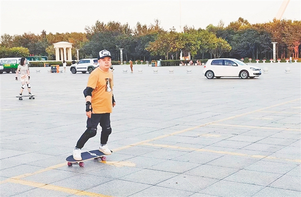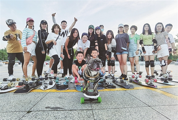 7月21日18時許,太陽島地鐵站出口附近的小廣場,一群人抱著陸沖板陸續(xù)趕到,其中“80后”“90后”居多,還有帶孩子來的“寶媽”。不少人來的時候穿著上班的職業(yè)裝,換上圓領T恤,戴上鴨舌帽,配齊護具,簡單熱身后,迫不及待地開滑。