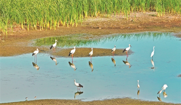 “此次現(xiàn)身的東方白鸛數(shù)量有近百只,且已在濕地停留10余日。以往東方白鸛只有在春秋遷徙季節(jié)才經(jīng)停安邦河濕地,在這個季節(jié)現(xiàn)身,屬史上首次?!卑舶詈訚竦刈匀槐Wo區(qū)管理局旅游科科長王偉介紹。