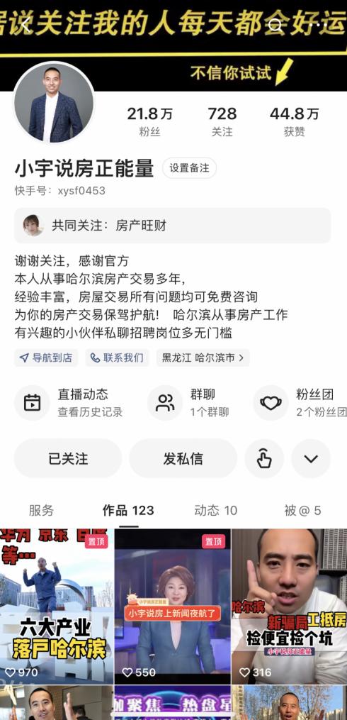 “松北這個(gè)小區(qū),現(xiàn)房7000起步”、“這里是江南核心商業(yè)圈,通勤便利”、“這可以說是哈爾濱二環(huán)旁配套設(shè)施最全的樓盤”……晚上8點(diǎn),每當(dāng)夜幕降臨,房產(chǎn)主播小宇(快手ID:xysf0453)會(huì)準(zhǔn)時(shí)出現(xiàn)在快手平臺(tái)直播間,為廣大有購(gòu)房需求的客戶答疑解惑。