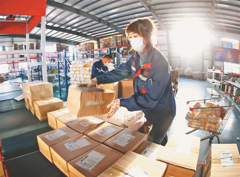 俄品多倉(cāng)儲(chǔ)配送中心工作人員包裝配送線上商品。