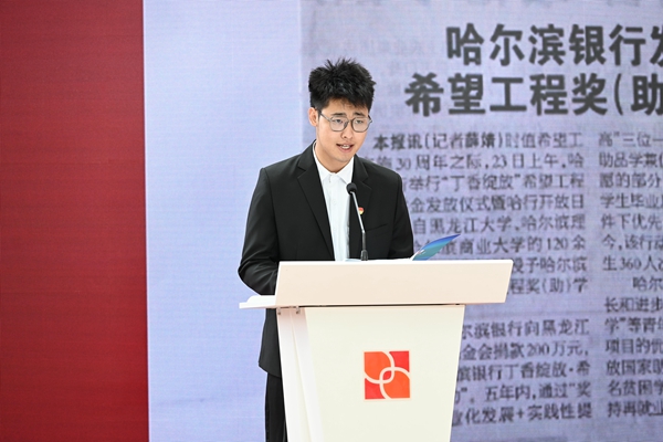來自哈爾濱理工大學(xué)的獲獎學(xué)生程同學(xué)代表全體獲獎學(xué)生向共青團、希望工程、哈爾濱銀行表示感謝,并表達了自己在課業(yè)之余會積極參加“丁香綻放·童心港灣”等志愿服務(wù)項目,把公益火種延續(xù)下去。
