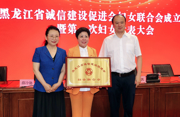 省直機(jī)關(guān)工委副書記、全省性社會組織黨委書記徐凱,省婦女聯(lián)合會黨組成員、省政府婦兒工委辦主任姜秀麗為黑龍江省誠信建設(shè)促進(jìn)會婦女聯(lián)合會頒發(fā)牌匾。