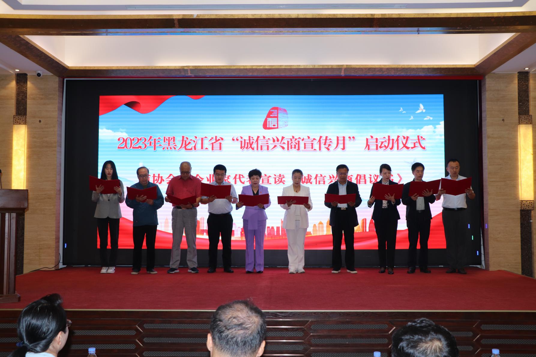 省委宣傳部、省直機(jī)關(guān)工委、省商務(wù)廳、省交通運(yùn)輸廳、省文旅廳、省國資委、省營商環(huán)境建設(shè)監(jiān)督局、哈爾濱海關(guān)、省稅務(wù)局、省市場監(jiān)督管理局、省外匯管理局、省高級人民法院、省工商聯(lián)、哈爾濱商業(yè)大學(xué)、省廣播電視臺(tái)等相關(guān)單位人員,省誠信建設(shè)促進(jìn)會(huì)、省社會(huì)保障行業(yè)協(xié)會(huì)、省內(nèi)行業(yè)商協(xié)會(huì)負(fù)責(zé)人,優(yōu)秀企業(yè)代表及媒體代表等100余人參加了啟動(dòng)儀式。